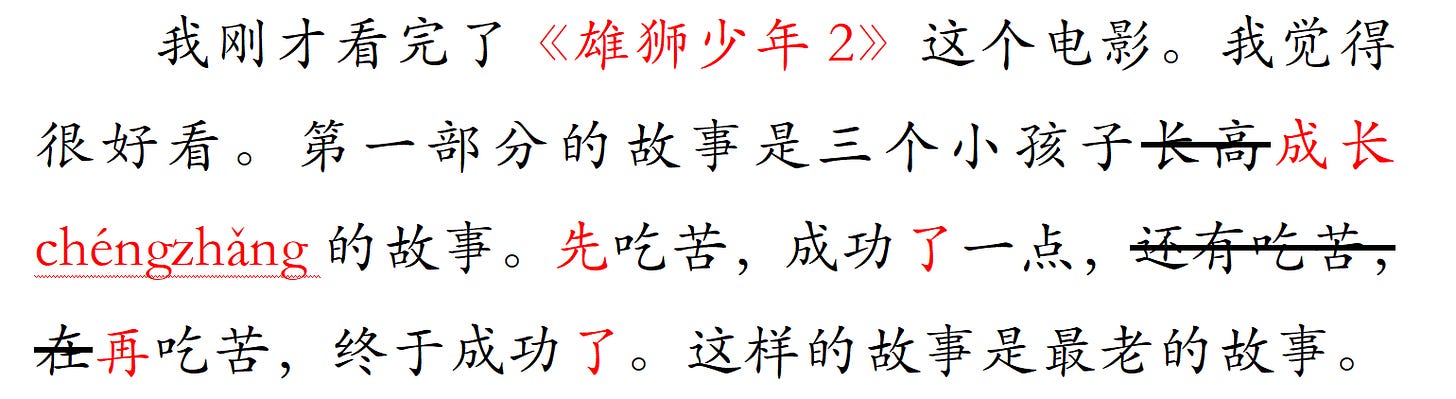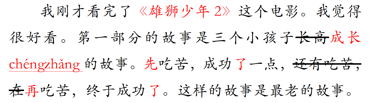 我刚才看完了《雄狮少年2》这个电影。我觉得很好看。第一部分的故事是三个小孩子成长的故事。先吃苦,成功了一点,再吃苦,在吃苦,终于成功了。这样的故事是最老的故事。